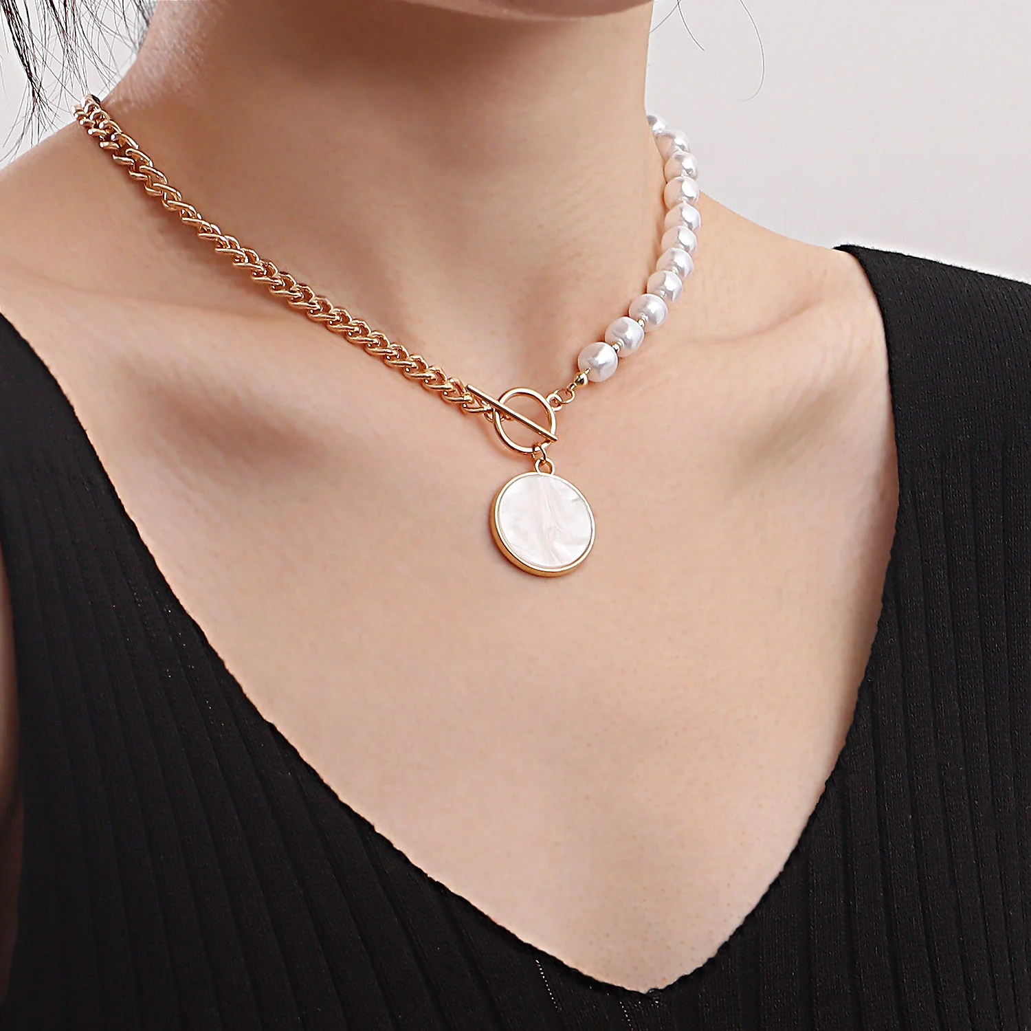 שרשרת כדורי פנינים בשילוב גורמט זהב אדום ועליו תליון בצורת מטבע, שרשרת מיוחדת עם המון נוכחות!